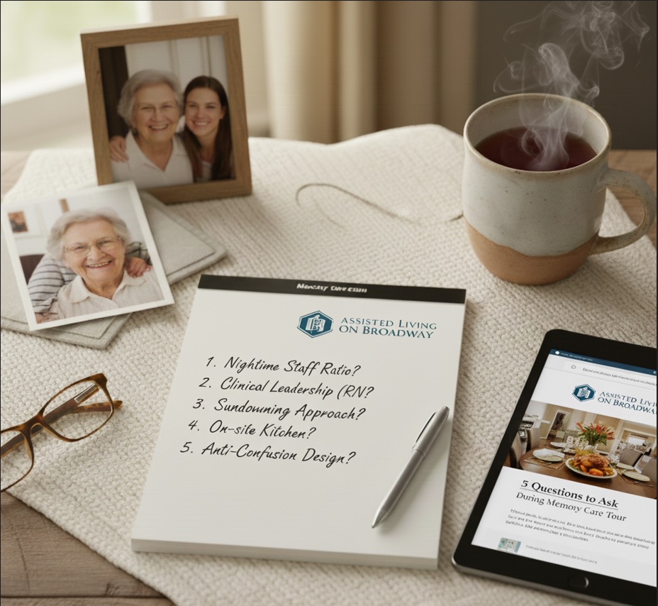 Ultimately, the right memory care community isn’t defined by its architecture, but by the people inside it. Don’t settle for answers that only sound good in a brochure. At Assisted Living on Broadway, our RN-ownership and 1:6 staffing ratio aren’t just policies—they are our promise to you that your loved one will be seen, heard, and cared for at all times. Contact us today to schedule your visit, so we can answer the 5 Essential Questions for Your Memory Care. And experience the peace of mind that comes from choosing a home built on clinical expertise and genuine connection.